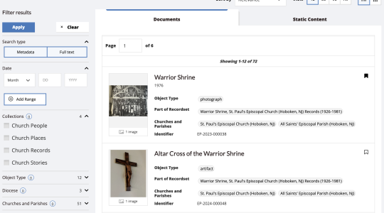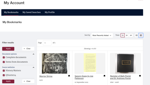 Bookmarked items and images will be listed when you log in to My Account as documents and items.Clicking on a bookmarked record will open the record in a new page. Use the sidebar filters to reduce your list of bookmarks to show either complete assets or individual items that you’ve bookmarked. Within My Account, you can view your bookmarked assets using a gallery-style format or for more information, select a list view.
